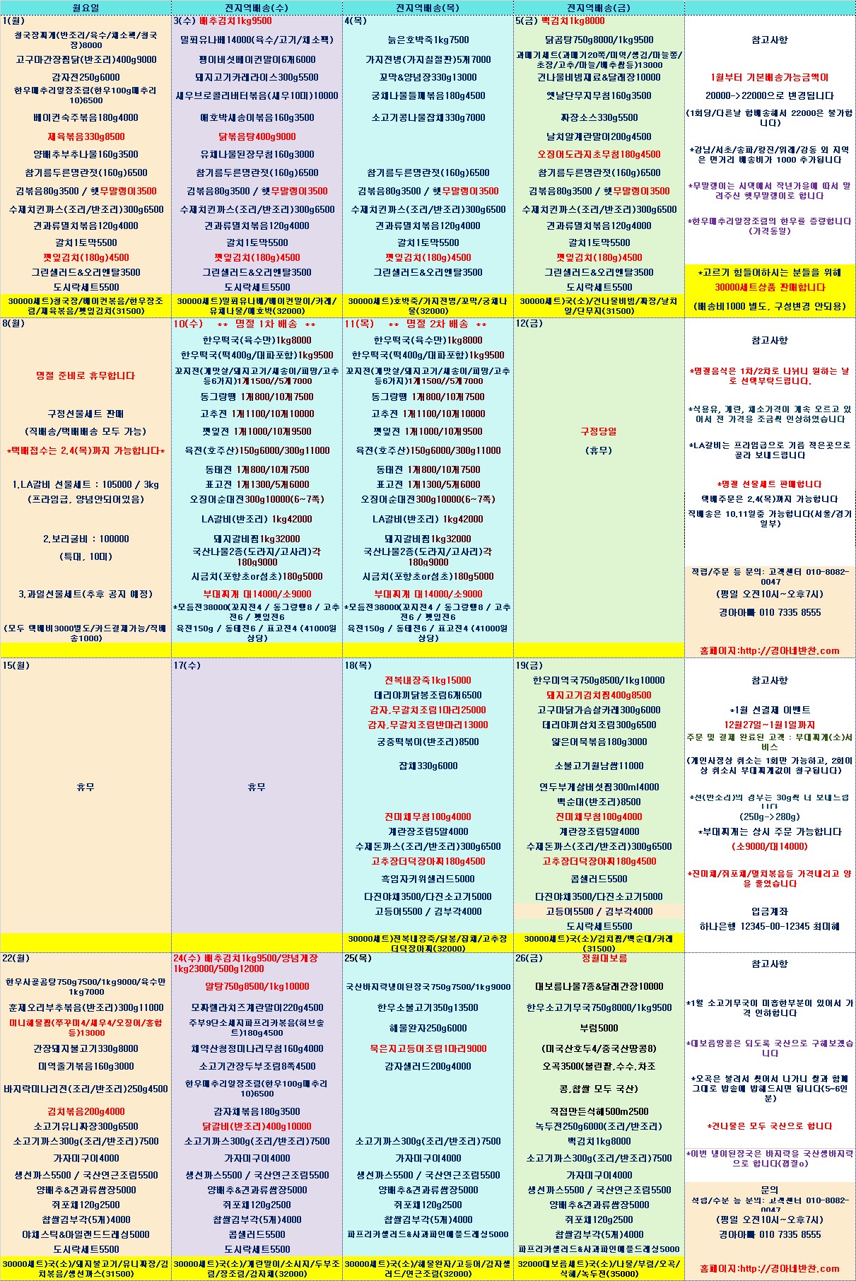 안녕하세요? 벌써 2021년도 2월이 되어가네요 ㅎ 다음달엔 구정과 정월대보름이 있습니다. 2월 식단은 고민을 많이 했는데요 원래 명절때는 채소값이 폭등하는데 올해는 태풍과 긴 장마로 작황이 안좋아서 벌써부터 오르는데다 계란과 식용유및 공산품까지 다 오르고 있어서.. 고민하느라 좀 늦어졌습니다 그래서 몇가지는 가격을 내리고 구정음식은 가격을 좀 인상하였습니다. 부디 너그러운 양해 간절히 부탁드립니다 꾸벅. **명절 배송은 서울및 경기 일부는 2.10(수)/2.11(목) 2회에 걸쳐 직배송합니다 서울은 양일간에 선택 가능하고 경기권은 지역별 신청요일이 다릅니다 2.10(수):안양,군포,광명,수원,안산,일산,부천,김포.시흥(시화) 2.11(목):분당/성남/하남/용인 이 외의 지역은 택배로 가능합니다 **명절음식을 지방에 택배로 보내고 싶으신 분들은 2.5(금)하루 가능합니다 (2.5(금)조리후 발송->(토)수령예상) 많이 준비할수는 없어서 조기마감 가능성 있습니다. **명절 선물세트 구매 가능합니다. 굴비와 LA갈비는 카드결제 가능하며 과일도 가능하도록 해보겠습니다 **2월 선주문 이벤트 : ~2.1까지 20만원이상 주문 및 결제 완료 고객 : 부대(소) 증정 ->날짜 지정해주세요 010 8082 0047 **1월30만원 이상 구매고객 후적립이벤트 : 구매금액의 2%추가적립(기본1%추가2%) 1월40만원 이상 구매고객 후적립이벤트 : 구매금액의 4%추가적립 (적립기간: ~2월10일까지) ->2월도 동일하게 적용할 예정입니다 월말 지나 익월초에 적립요청 부탁 드립니다 010 8082 0047 저희 명절 전은 특별합니다 ㅎ 다른 음식은 맛보다는 신뢰와 위생에 더 자부심을 느끼는데 ^^;; 명절 전은 다른 어느곳보다 훌륭하다고 생각합니다!! 특별한 날이니만큼 특별하게 해드립니다 고추전의 고추는 큰 오이고추로 깻잎, 표고등도 큰걸로 골라서 보내드려요 고기,계란 아끼지 않고 해표 식용유로 맑고 깨끗하게 부쳐드립니다 나물도 모두 국산으로 사용합니다 많은 이용 부탁드리겠습니다 감사합니다~ ^^