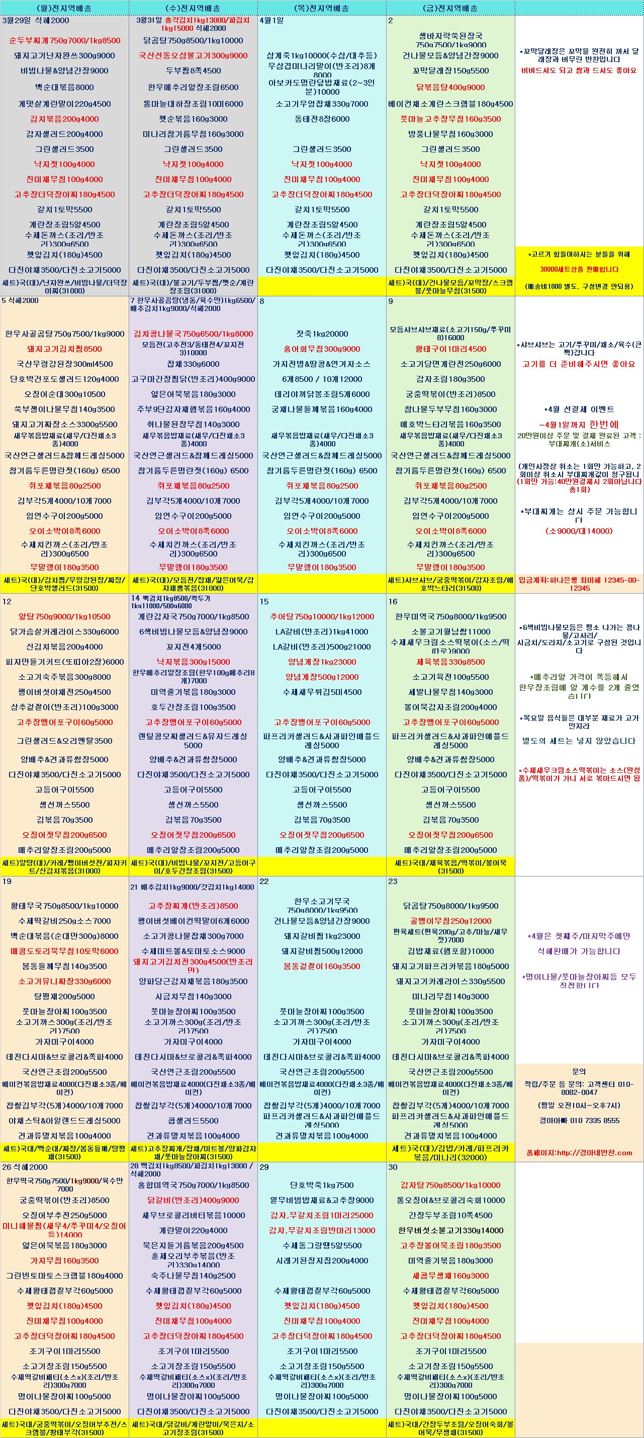 안녕하세요? 벌써 4월이 오네요 ^^ 4월은 봄이니만큼 봄나물을 많이 넣어보았고 몇가지 신메뉴들을 넣어보았습니다. 4월은 도시락이 없습니다 저희 가게 운영시간상 도시락 할 시간이 도저히 나오지 않네요 ㅠ 다들 퇴근 후 혼자 하다보니, 일이 너무 늦어져서... 부득이하게 준비가 어려울 듯 합니다, 죄송합니다 4월~5월31일까지 45만원이상 선결제시 10% 적립해드리는 이벤트 중입니다 예)45만원결제->495000점 적립 / 58만원결제->638000점 적립 사용기한은 50만원 당 3개월이고 중도에 전액 환불 시 적립혜택 적용되지 않은 금액으로 환불됩니다 해당 이벤트는 두달간 상시 결제 가능합니다 현금/제로페이/지역상품권/카드승인(수기결제)등(홈페이지 결제 외 모두 가능) 4월 선결제이벤트는 위와 별개로, 기존처럼 적용됩니다 ~4.1까지 20만원 이상 한번에 결제 및 주문 시 부대찌개(소)1 개 서비스합니다 (20만원당 하나씩은 아닙니다, 50을 결제해도 한번만 나갑니다) 4월에는 가게를 약간 넓히는 공사가 이뤄집니다 복작이며 실수내지 않고 더 편한 환경에서 일에 차질없이 전념할 수 있도록 많이 도와주세요.. ^^ 많이 노력하겠습니다 감사합니다