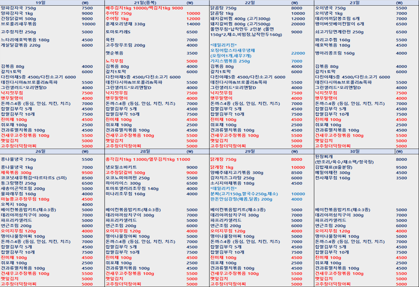안녕하세요? 영양사님이 심혈을 기울인 식단이 나왔습니다 ㅎ 사실 한달안에 저희 스타일과 가능한 작업을 다 파악하긴 힘들거라 기존식단과 크게 벗어난것은 아직 많지 않습니다만 점차 다양해질 것입니다. 다음달 식단은 가격이 약간씩 인상되는 부분이 있습니다 조만간 용기를 다 바꿀 예정이고 공산품 가격이 오른지 오래라.. 재료비40%까지 버티다가 이달은 조금 인상하였습니다. 저희는 모든 돼지고기.닭고기를 국산 냉장으로 사용합니다 채소류도 거의 국산이에용 스페인산이나 수입, 냉동계육을 쓰면 단가가 많이 줄어들지만 원하시는게 뭔지 고민하다 재료에의 신뢰가 큰 부분이시라 단가를 낮추려 수입을 쓰지 않습니다. 타 반찬가게보다 비싼 감이 있더라도 이점 감안해주셨음 좋겠습니다 ㅎ ㅜ.ㅠ 또 6월에 한시적으로 20000 배송을 했는데 주문액은 감소하고 주문량은 늘어서 배송비지출이 커지게되어.. 부득이 다시 22000 으로 조정합니다 부디 많은 양해 부탁드립니다 하절기는 나물류. 상하기쉬운 국 종류는 최소화했습니다 생고기류 음식은 조리로 보내드릴 예정입니다 다음달부터 돈까스류 4종과 밑반찬류는 상시판매합니다 까스류를 좀 색다르게 시도해볼 예정이구요 까스류 양은 기존처럼 300g 입니다. 하절기라 조리상태로 나갑니다 그리고 매주 목요일 데일리키친이라는 메뉴가 있어요 가평에서 데일리키친을 운영하시는 동생인데 목요일은 이쪽으로 와서 그가게 대표반찬 두가지씩을 해줄 예정입니다 식재료나 위생등 저보다 훨씬 엄격한 분이라.. ㅎ 퀄리티는 믿어도 좋을듯 합니다 다음달도 선결제 20 이상 부대찌개 제공해드립니다 휴가기간은 7.31~8.7 입니다 휴가기간은 더 많은것들을 변화시킬 예정입니다 감사합니다 ^^ ![]() ![]() |