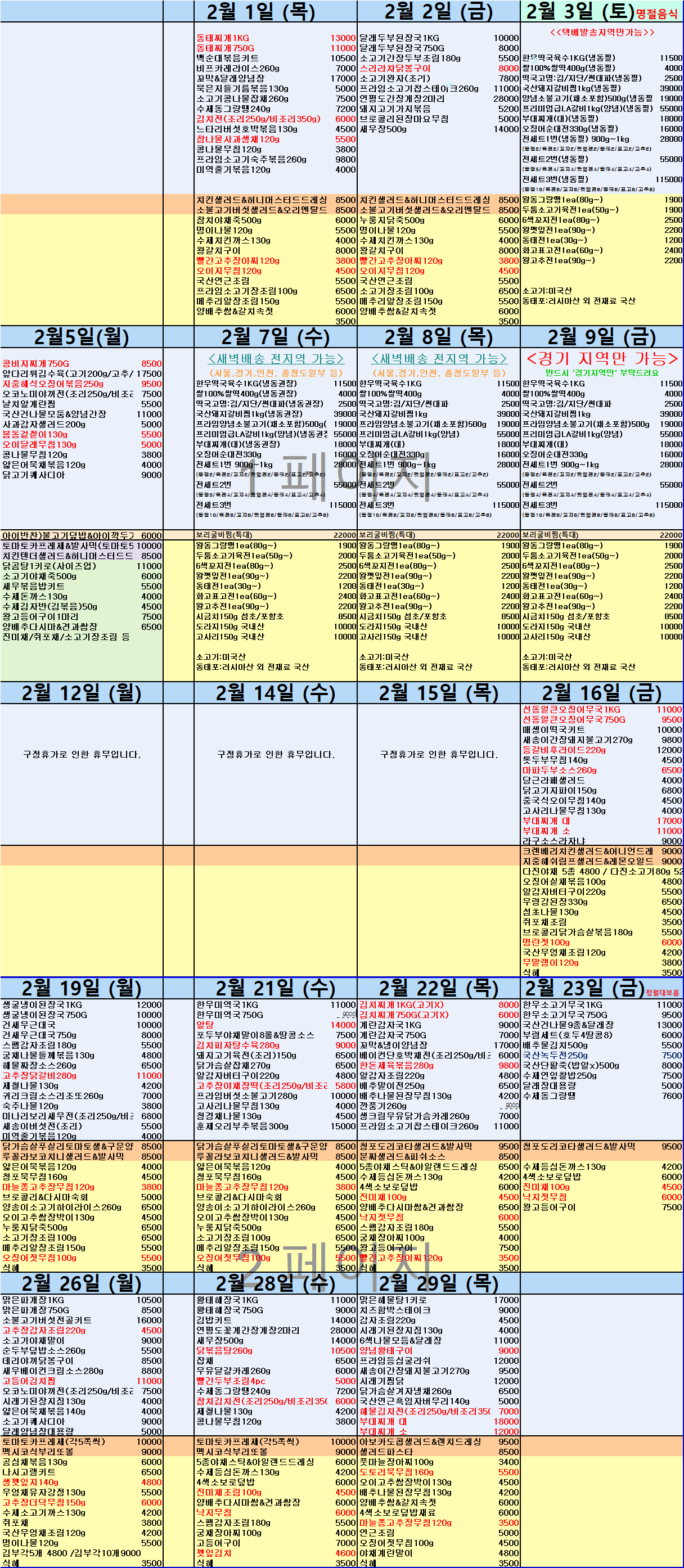 2월 식단표 등록이 완료되었습니다. ? 2월에는 ?[명절 음식 4일]?과 [정월대보름 특식]이 준비 되어있습니다. 구정 휴무 이후 2월 16일부터 정상 주문이 가능한 점도 참고 부탁드리겠습니다. ? 늘 경아네를 믿고 이용해주셔서 감사합니다. ? *명절음식 주문지역 및 날짜 안내 (수령일 기준) - 2월 3일 (토) ▶ 택배지역 - 2월 7일 (수) ▶ 서울/경기/인천/충청도 일부 - 2월 8일 (목) ▶ 서울/경기/인천/충청도 일부 - 2월 9일 (금) ▶ 경기 지역 ![]() ? |