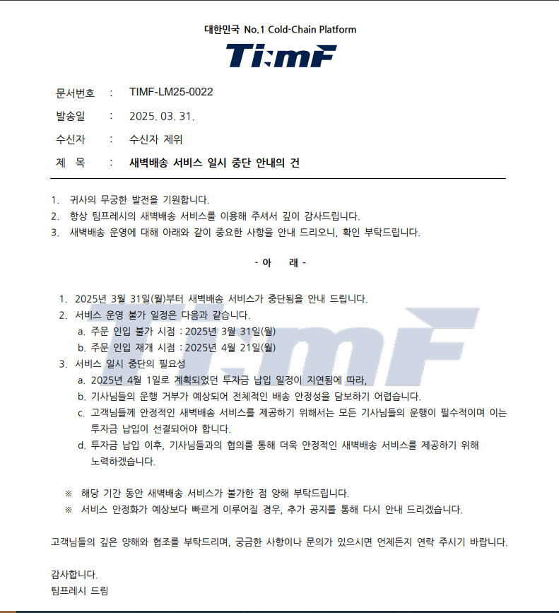 안녕하세요 ㅠㅠ 죄송합니다 ? 지금 배송사 접수불가로, 당장 오늘부터 전체 택배 배송을 해야할 판입니다. 근데 택배사도 팀프레시를 통해서 접수한 지라, 다른 새벽배송 업체와 택배사를 따로 계약하고 하려면 시간이 필요해서 이번주 배송은 아무래도 원활하지 않을 것 같습니다. ? 그래서 이번주는 아무래도 배송 이슈가 좀 생길 것 같아요 우선은 이번주는 전체 한진택배로 발송합니다. ? 자택이 한진택배 배송이 늦는 지역이면 주문시에 참고 해 주세요 ㅠ_ㅠ 종이박스가 아닌 아이스박스로 보내드릴 예정입니다. ? 이번주 내로 새 업체를 찾던지 배송기사를 다시 쓰던지 좀 생각해보고 대책을 마련하겠습니다. ? 감사합니다. |