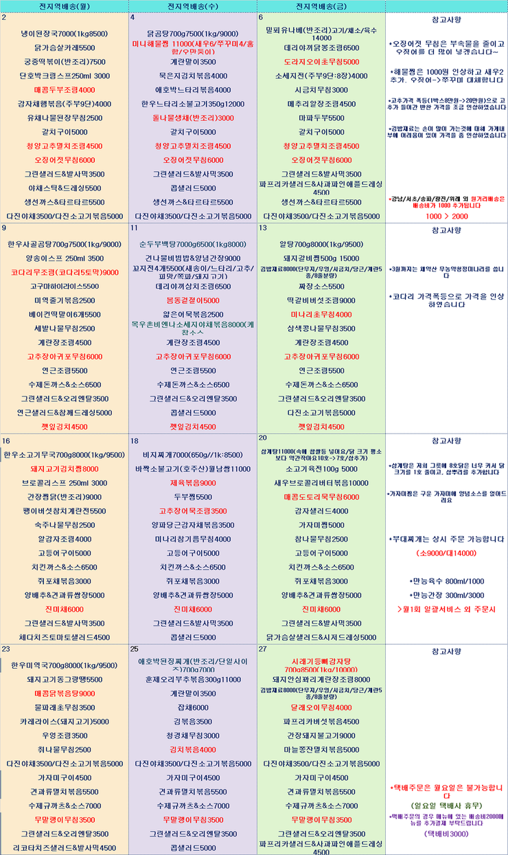 안녕하세요? 경아엄마입니다 ^^ 3월은 총4주간으로 마지막이틀은 4월에 주문받겠습니다 *현재 열매류(호박/고추등) 가격폭등으로 고춧값이 많이 인상되었습니다(코다리도요) 사실 언제나 인상만 되는 것 같네요... 내리는건 왜 없는지 ^^;; 그래서 저희도 몇가지는 인상하였고 또 몇가지는 내렸습니다 김밥재료는, 사실 그동안 할때마다 가게에 어려움이 많았습니다 손이 너무 많이 가서 ㅠㅠㅠㅠㅠㅠ 단무지가격도 생각보다 비싸서 김밥재료 가격을 좀 높였습니다 좀더 깔끔한 포장도 병행하겠습니다 부디 양해 부탁드리겠습니다! *현재 배송지역인 강남/서초/광진/위례/송파/강동 이외의 서울지역은 먼거리 배송비 1000원이 추가됩니다, 꼭 선택부탁드려요 (기본1000+1000원) *서울지역이 아닌 지역은 택배배송비를 꼭 선택해주세요(기본1000+택배배송비2000) ->월요일 반찬은 택배배송 불가능합니다/택배사 휴무 *기존 배송지 분들께서는 배송비추가버튼을 누르지 말아주세요 ^^;;;; 장바구니에서 자동으로 추가됩니다! 다음달에도 과일 및 한스쿠키, 그리고 비건 빵집도 어쩌면 선보일수 있을지 모르겠습니다 좀 더 편하게 주문하시도록 홈페이지를 개편할 예정이니 조금만 더 양해해주세요.. ^^;; (아주버님 친구라 요구하기가 참 난감해서 자꾸 늦어지네요;;;;;;;;) 감사합니다! 입금계좌 : 우리은행 최미혜 010 7538 0047 |
