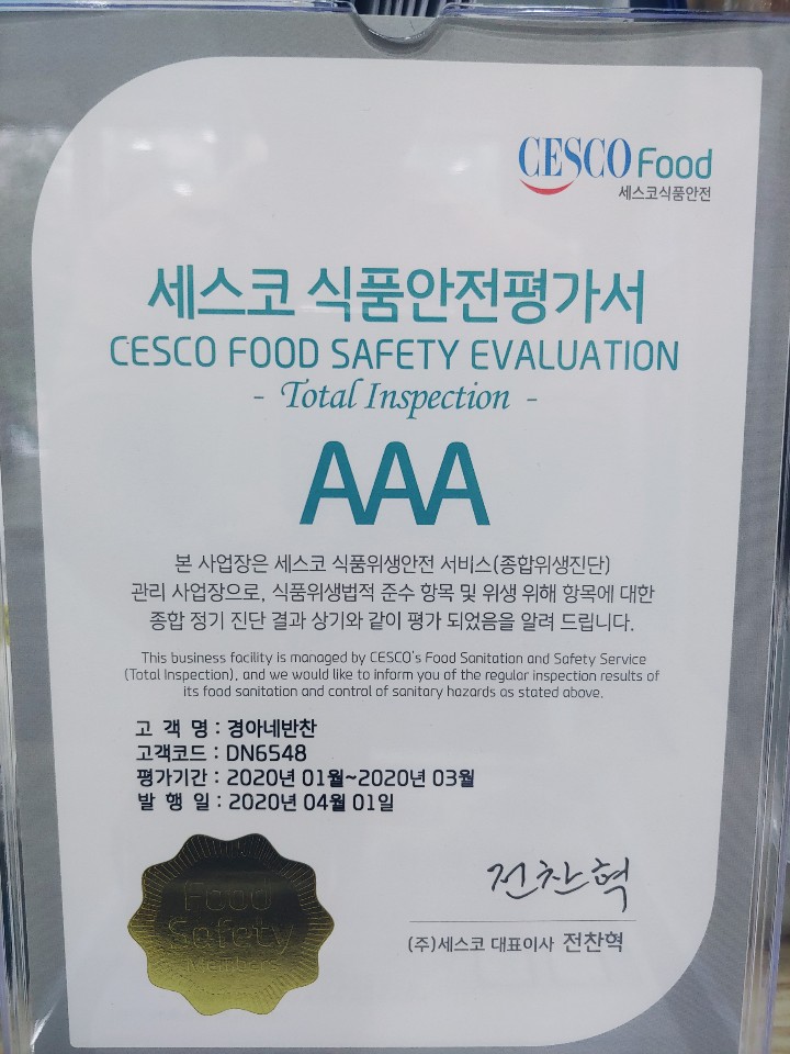 안녕하세요? 경아네반찬 입니다. 어제 경아네반찬 세스코에서 좋은 소식을 보내줬습니다. 매달 세스코에서 식자재 관리부터 종업원 위생상태까지 까다로운 검사를 받는데요~ 3개월 연속 평가점수 90점 이상인 고객에게 부여되는 A3 최고 등급을 받았습니다. ^^ 앞으로 더 위생에 철저한 경아네반찬이 되도록 노력하겠습니다. 감사합니다. ^^ ![]() ? ![]() ? |