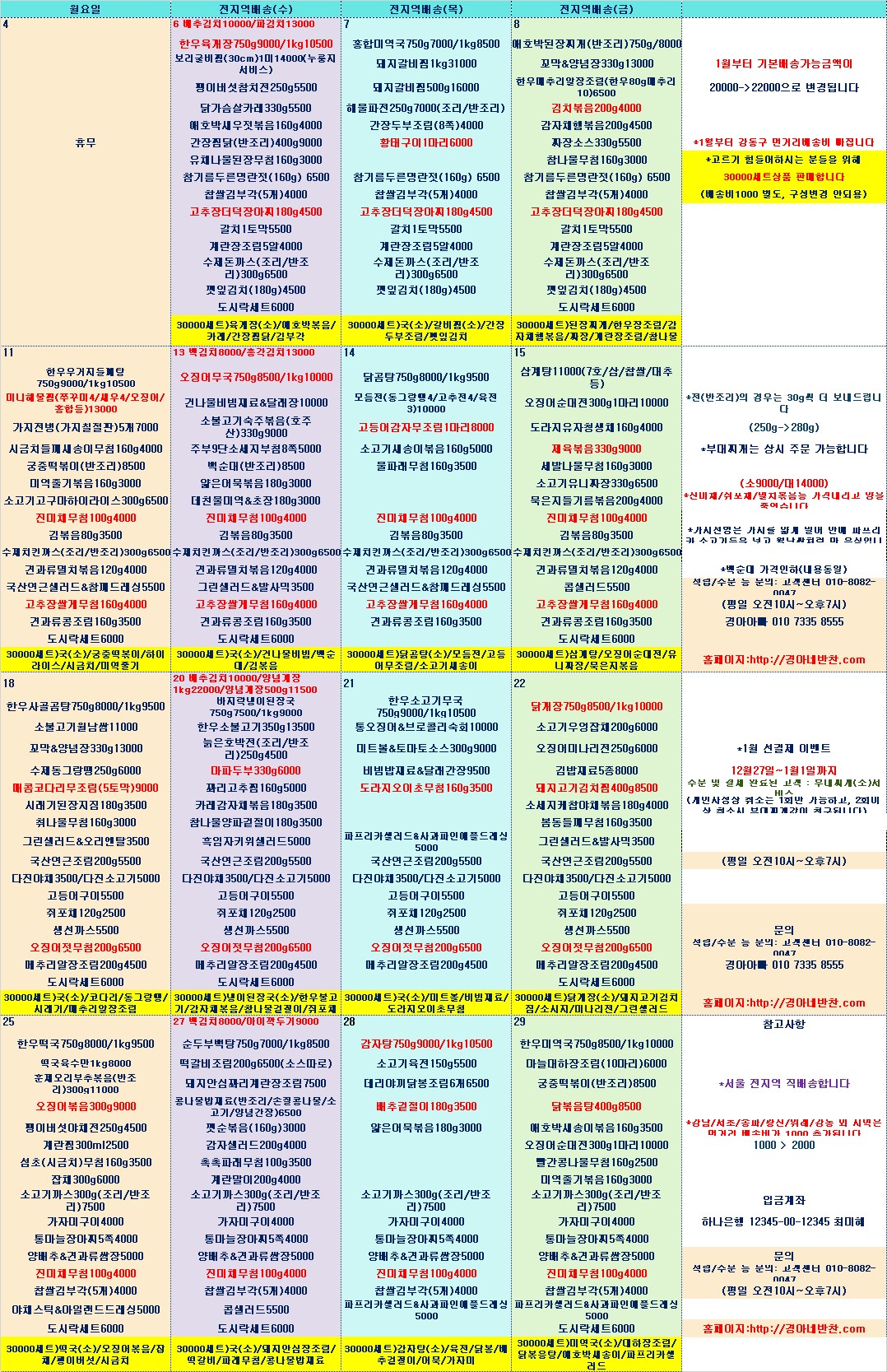 안녕하세요? 경아엄마입니다. 1월부터 몇가지 바뀔것들이 있어서 미루다.. 무거운 마음으로 ㅎ 이제사 올립니다. 다음달부터는 기본주문가능금액이 20000원 -> 22000원 으로 인상됩니다. 힘든 시기인지라 올리는 것이 참 고민되었는데... 대부분의 분들이 22000원 이상 시키셔서 큰 무리는 없을거라는 기대와 한우 갈비찜, 꼬막같은 비싼식재료 음식들은 사실 재료비가 50%가 넘는지라 20000원 으로 하게 되니 배송비까지 감당이 힘든 부분이 있었습니다 부디 너그러운 이해 부탁드립니다. 꾸벅~ 강동구 지역은 먼거리 배송비1000이 빠집니다. 그래서 기본배송비 1000만 내시면 되세요. 강동구 고객이 여덟분~ 정도 되셔서 가격을 내릴 수 있었습니다. 집에 있을 아이들을 위해 도시락세트를 월수금 판매합니다. 반찬가지수를 6가지로 하다보니 무리가 있어서, 반찬4가지(아이들 좋아하는 계란,소세지,고기등)에 국1가지로 총 5가지가 나가게 되고 모두 전자렌지 가능 용기로 나가서 아이 혼자서도 데워먹을 수 있게끔 나갑니다. 가격은 6000 입니다(전자렌지용 그릇가격때문에,,) 식단의 반찬과 겹치지 않습니다. 저희 양에 부담스러워하는 분들이 많으셔서 국/메인류를 제외한 밑반찬류는 가격을 조금 낯추고 양도 조금 줄였습니다. 많은 양이 와서 부담스러운것보다 적게 종종 부담없이 시켜드실 수 있기를 바라는 마음입니다. 그리고 가락시장이 1월1일~1월4일까지 휴무라 매일 당일아침 장을 보는 저희로써는 미리 사서 보관할곳도 없고 해서 부득이하게 휴무를 하려합니다. 코로나로 나가기 힘든 시기에 불편드려 죄송합니다. 1월 선주문 이벤트는 오늘부터~1월1일 자정까지 20만원 이상 주문과 결제까지 완료된 고객에 한해 부대찌개(소)보내드려요~ 그리고 1월부터는 월40만원 이상 주문 고객에게 별도의 혜택 또 1회주문이5만원 넘을 경우 배송비면제기능 들을 넣을 생각이니 많은 이용 부탁드립니다. 다음달에도 종종 합배송이벤트&여러가지 이벤트들을 준비할께요~ 모두 건강한 연말 되세요. 감사합니다!!