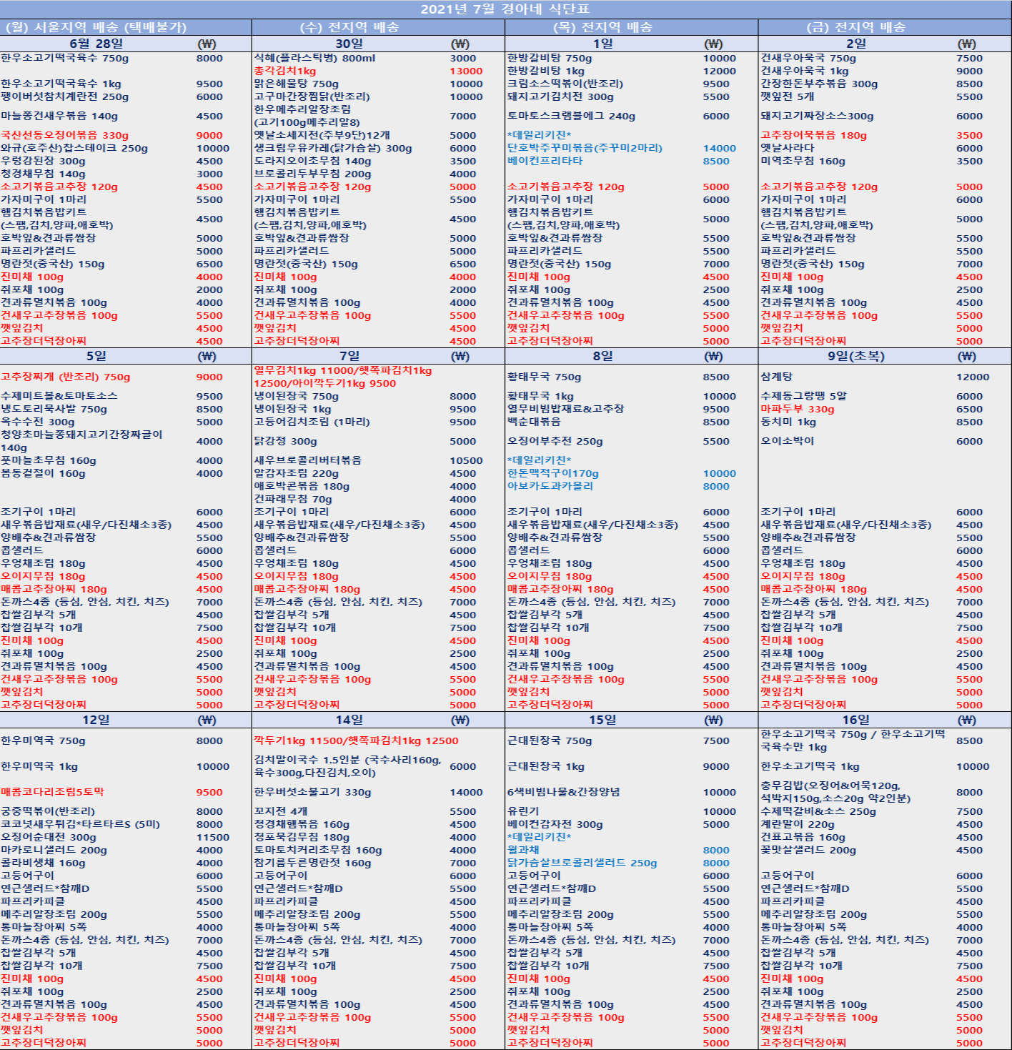 안녕하세요? 영양사님이 심혈을 기울인 식단이 나왔습니다 ㅎ 사실 한달안에 저희 스타일과 가능한 작업을 다 파악하긴 힘들거라 기존식단과 크게 벗어난것은 아직 많지 않습니다만 점차 다양해질 것입니다. 다음달 식단은 가격이 약간씩 인상되는 부분이 있습니다 조만간 용기를 다 바꿀 예정이고 공산품 가격이 오른지 오래라.. 재료비40%까지 버티다가 이달은 조금 인상하였습니다. 저희는 모든 돼지고기.닭고기를 국산 냉장으로 사용합니다 채소류도 거의 국산이에용 스페인산이나 수입, 냉동계육을 쓰면 단가가 많이 줄어들지만 원하시는게 뭔지 고민하다 재료에의 신뢰가 큰 부분이시라 단가를 낮추려 수입을 쓰지 않습니다. 타 반찬가게보다 비싼 감이 있더라도 이점 감안해주셨음 좋겠습니다 ㅎ ㅜ.ㅠ 또 6월에 한시적으로 20000 배송을 했는데 주문액은 감소하고 주문량은 늘어서 배송비지출이 커지게되어.. 부득이 다시 22000 으로 조정합니다 부디 많은 양해 부탁드립니다 하절기는 나물류. 상하기쉬운 국 종류는 최소화했습니다 생고기류 음식은 조리로 보내드릴 예정입니다 다음달부터 돈까스류 4종과 밑반찬류는 상시판매합니다 까스류를 좀 색다르게 시도해볼 예정이구요 까스류 양은 기존처럼 300g 입니다. 하절기라 조리상태로 나갑니다 그리고 매주 목요일 데일리키친이라는 메뉴가 있어요 가평에서 데일리키친을 운영하시는 동생인데 목요일은 이쪽으로 와서 그가게 대표반찬 두가지씩을 해줄 예정입니다 식재료나 위생등 저보다 훨씬 엄격한 분이라.. ㅎ 퀄리티는 믿어도 좋을듯 합니다 다음달도 선결제 20 이상 부대찌개 제공해드립니다 휴가기간은 7.31~8.7 입니다 휴가기간은 더 많은것들을 변화시킬 예정입니다 감사합니다 ^^ ![]() ![]() |