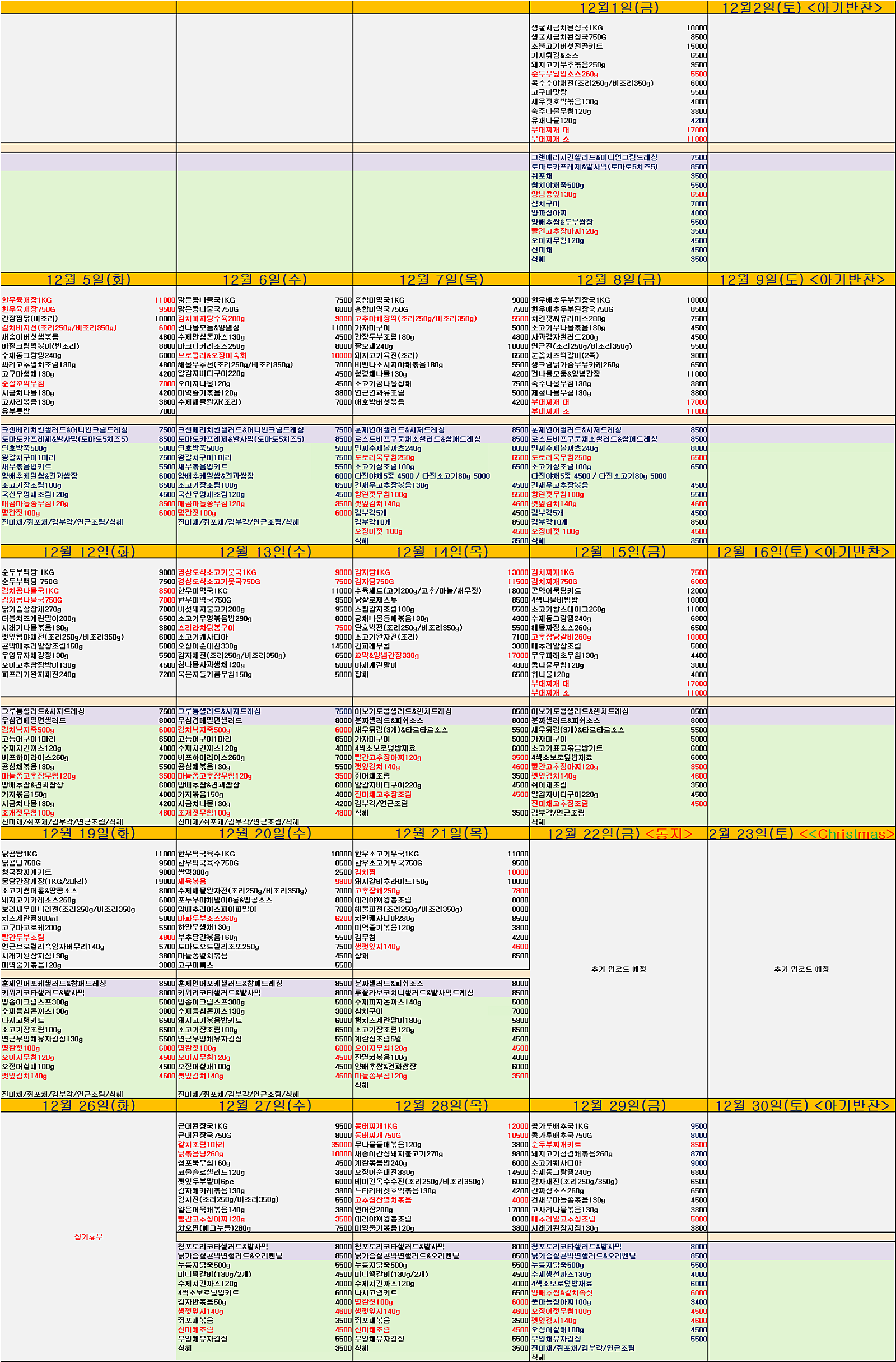 안녕하세요 12월 식단표 등록이 완료 되었습니다. (12월 22일 / 23일 제외) ? 12월 22일은 <동지> 특식 준비 중이고, 12월 23일은 <크리스마스> 특식? 준비 중입니다. ? 상기 이틀 메뉴는 추가 공지 예정이십니다. ? 늘 경아네를 믿고 이용해주셔서 감사합니다. |