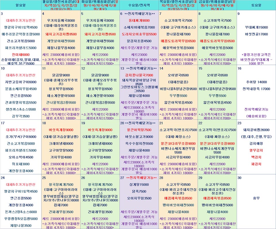 6월 식단표 입니다 ^^ 보고 많은 이용 부탁드립니다. 월정기식으로 주문 하면 한번에 한 달분을 다 주문해서 좋아요 적립금이 3프로도 생겨서 좋습니다 그리고 모바일에서 보실 때 화면을 손으로 키워서 보면 잘 보입니다. 매일반찬과 대체찬을 보실 때 참고하시고 바꾸는 것은 주문하기에서 구매하기 누르면 매일반찬과 국대체찬을 누르면 바꿀수가 있습니다. 소가족식은 반찬 변경은 불가능하고 국은 소가족 대체찬이라고 금액이 0으로 적혀있는 메뉴를 누르면 바꿔서 나가도록 하겠습니다.^^ |